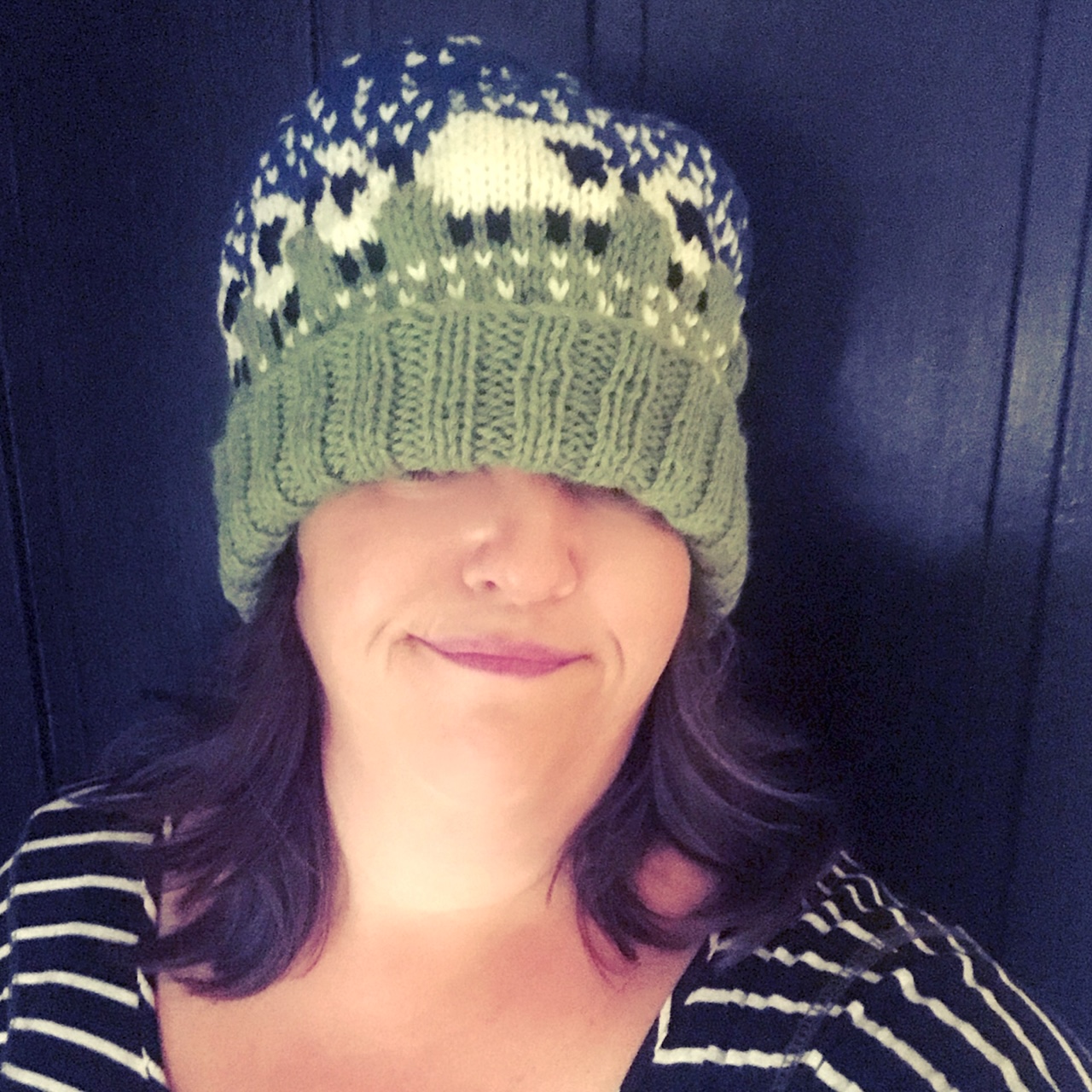 Jo-Ann had the brilliant idea of ripping it back and turning it into a cowl. I tried that and it was soft and cute but ultimately was a disservice to the pattern. As in, it just looked like a blue, green and white striped cowl because you couldn’t tell there were sheep.